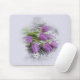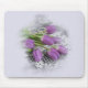 Buquê de tulipa roxo em um lugar antiquado doily com fundo de lavanda pastel.