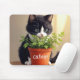 Um gatinho preto e branco senta-se atrás de um pote de argila com uma planta de catnip rotulada "catnip"