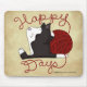 Um gato preto e branco, gordinho, de smoking, se inclina numa grande bola de fio vermelho. As palavras "Dias Felizes" são escritas com o fio. Design original é de Christie Black of Creations do Coração.