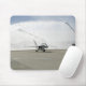 Um avião F-18 rolha debaixo do spray de caminhões-bombeiros com F-18.