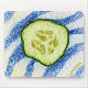 Um lápis e desenho de caneta de uma fatia de um pepino em uma toalha de mesa.