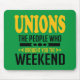 Trabalhe em duro, jogue duro - e mostre seu apoio para trabalho organizado com este na moda mousepad! Apresentando as palavras "Unions: The Pessoas Who Trouxe You the Weekend" (Uniões: As que vos Trouxeram o Fim de Semana), este painel de discussão é uma celebração dos incansáveis esforços dos sindicatos para garantir melhores condições de trabalho e benefícios aos trabalhadores em todo o lado.