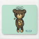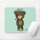 Um mouse personalizado com uma simples ilustração de um ursinho marrom de desenho animado segurando uma margarida amarela. Olá, escrito sobre a cabeça.