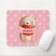 Um mouse pad com uma ilustração de aquarela fofa. Um ursinho castanho carregando um grande coração vermelho. Bolinhas amarelas claras em fundo rosa.
