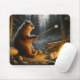 Urso-marrom assando um marshmallow sobre uma fogueira na floresta