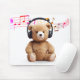 Os fones de ouvido vestidos de ursinho castanho-branco em fundo branco com notas de música neon A cor de fundo pode ser alterada.