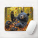 Um urso negro batendo alegremente através de uma pilha vibrante de folhas de outono numa floresta serena, abraçando a beleza das estações em mutação da natureza