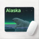Um momento pacífico na longa noite árctica. Um Urso Polar repousa na borda de uma área aberta no gelo da matilha. As Luzes do Norte brilham à distância; estrelas brilhantes brilham sobre a cabeça. A leitura de texto "Alaska" aparece em verde e branco brilhantes. Os ursos polares estão ameaçados. Quanto tempo mais cenas como esta poderão ocorrer? Por favor, ajude a salvar os Ursos Polares da extinção.