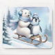 Urso polar e pinguim estão vestindo algemas e lenços, alegremente cavalgando um trenó abaixo de uma prega de neve