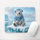 Um urso polar vestindo uma camisola azul, pulgas e um chapéu sentado em um icebergue enquanto segurava um jornal chamado "Notícias Polares".
