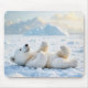 Um filhote de urso polar brincalhão deita-se nas costas de uma paisagem Ártica nevada cercada por flocos de neve suavemente caindo