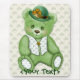 Um urso verde bonito está pronto para Ruas. Dia de Patrick com seu adorável chapéu irlandês e colete com impressão e sotaques de shamrock. Adicionar texto para toque personalizado especial.