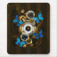 Composição do relógio de aço redondo com discagem numérica romana preta, decorado com engrenagens de ouro e latão, borboletas morfo azuis e lentes danificadas sobre fundo listrado castanho. Estilo Steampunk.