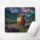 Linda vaca Highland cercada de montanhas verdes e brilhantes e nebulosas coloridas no céu. ARTE AI CRIADA POR MINX267