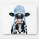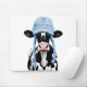 A ilustração apresenta uma vaca negra e branca vestindo um chapéu azul de inverno com tocas e cordas trançadas. A imagem combina elementos da vida no campo com uma reviravolta humorística, retratando a vaca num estilo inesperado, que acrescenta um encanto único à imagem.