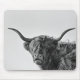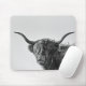 Mousepad com uma vaca resistente mas engraçada de Higland do Scottish com chifres grandes, uns cabelos longos na frente dos olhos e a metade da boca abre em preto e branco/monochrome.