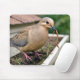 Uma pomba de luto com marcas distintivas segura um verme no seu bico enquanto se agita na borda de uma sarjeta de casa cheia de terra