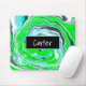 Pasta de mouse personalizada com padrões giratórios azuis, verdes e brancos.