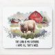 Ovelhas bonitas de aquarela num campo de fazenda com um celeiro vermelho e verso religioso. O texto é editável.