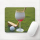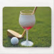 Um copo de vinho único, em forma de bola de golfe, cheio parcialmente de vinho tinto, senta-se sobre um relvado verde escrupuloso ao lado de um clube de golfe e bola