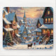 Uma vila pitoresca de inverno é adornada com telhados cobertos de neve e janelas muito iluminadas com pessoas e renas andando na rua nevada.