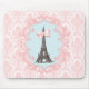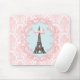 Este design é inspirado por Paris, cidade da forma e da luz! Caracteriza a torre Eiffel famosa no estilo da ilustração do vintage, onde uma luz - a fita cor-de-rosa coloca graciously na parte superior para adicionar um toque feminino. O fundo é feito de bolinhas azuis e brancas da luz - e do damasco cor-de-rosa e branco. Finalmente, é moldado por um quadro do estilo do vintage em redemoinhos cor-de-rosa.
