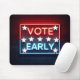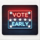 Luzes de néon vermelhas e azuis formam as palavras "VOTE PRECOCE" numa parede de tijolos escuros com estrelas brancas brilhantes