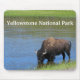 Esta foto de souvenir mostra um Bison americano ou búfalo parado em uma clara lagoa azul bebendo água, em um grande campo verde de grama no Parque Nacional Yellowstone em Wyoming.