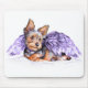 Doce Terrier Yorkshire descansando em uma nuvem tem asas de penas roxas. Yorkie Angel trará um sorriso para a cara de alguém a qualquer hora do ano!