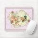 A jovem Marie Antoinette vestindo uma pena que se enquadrou com pergaminhos e rosas. O fundo é listras cor-de-rosa.