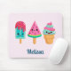 Mousepad com uma ilustração de 3 tratamentos de sorvete diferentes. Um picolé azul-esverdeado com gotas de morango e salpicadores coloridos. Um picolé de melancia. Um cone com camadas deliciosas de sorvete em rosa e menta. Todos com sorrisos kawaii fofos.