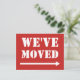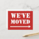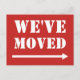 Alteração moderna das setas dos cartões postais de endereço. Cartões personalizados com fundo vermelho e texto de letras grandes. Cartões postais em movimento notáveis com ícone. Texto de movimentação personalizado; nós movemos! Eu me mudei ou nos mudamos! Adicione seu novo endereço da sua casa atrás. Cartões legal para novas casas, festas de aquecimento doméstico ou novos locais de negócios. Excelente para casa, compro, negócios, mercado fresco, loja, empresa, etc.