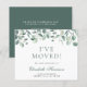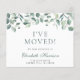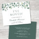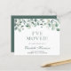 Anúncio comovente elegante e econômico com uma aquarela de eucalipto verde. Na frente, personalize com seu nome em um script verde na moda, altere o título "Eu Movi" se desejar e adicione seu novo endereço. Ao contrário, personalize seu anúncio com mais detalhes e inclua números de telefone e um endereço de e-mail, se desejar.