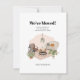 Mudando? Não se esqueça da mudança de cartões de endereço para que a família e os amigos saibam do seu novo lugar. Este cartão de anúncio móvel fará exatamente isso e você pode personalizá-lo em apenas alguns cliques. Possui uma sala sentada com um gato no sofá, uma planta interna, uma cadeira, tapete, mesa central e uma planta pendurada com um toque de buho rústico. Adicione seus detalhes clicando no botão "Personalizar" acima. O excelente como um guardião e pode ser personalizado como um convite de festas de limpeza doméstica.