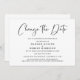 Anúncio de adiamento de casamento moderno minimalista preto e branco. "Mudar a Data" é escrito em uma fonte estilosa e você pode personalizar facilmente com os detalhes do adiamento do casamento.