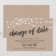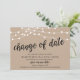 Este é um cartão de Anúncio de Casamento Adiado (Adiamento), com título do cartão, Mudança de data, em fonte de letra preta, tema de design de fazenda com luzes de corda kraft moderno e rústico.