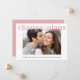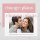 Um anúncio de adiamento de casamento fresco e alegre. "mudança de planos" está escrito na parte superior da sua foto de noivado favorita em tipografia rosa bege moderna, limpa e em negrito, e abaixo você pode personalizar seus nomes e anúncio de adiamento. No verso, você pode personalizar sua mensagem com mais detalhes em uma tipografia branca coordenada com um fundo rosa bege.