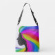 Bolsa as suas coisas em estilo com um saco de corpo cruzado ou bolsa de ombro fofo. Esta bolsa de super rancho apresenta a silhueta de uma mulher com cabelo arco-íris. O trabalho de arte tem efeito estático da TV com feixes de cores brancas e arco-íris ao longo de todo o processo.