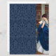 A mulher de vestido azul deixou a festa para a biblioteca.