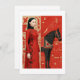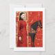 Mulher de vestido vermelho florado e cavalo preto