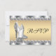 Mulher, festa de aniversário de prata e ouro, RSVP com belos calçados de salto alto e brilho prateado em um fundo de diamante de ouro. Este lindo RSVP prateado e dourado é facilmente personalizado para o seu evento simplesmente adicionando detalhes do seu evento, estilo da fonte, tamanho e cor da fonte e texto. Esta é uma design impressa sem brilho real, joias, folhas, etc.