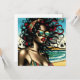 Bonito retrógrada americana em biquíni sentada na praia com óculos escuros em cores de vintage no estilo dos quadrinhos de pop-art.