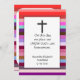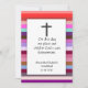 Esses convites coloridos e modernos para batismos apresentam faixas em múltiplos tons de rosa, roxo, azul e marrom. As listras estão em segundo plano e há uma área retangular branca com uma cruz negra e um texto em preto à frente. O texto diz "Neste dia, nós colocamos nosso filho sob a guarda de Deus para sempre" Abaixo está o nome e a data do batismo da criança. O texto pode ser personalizado para atender às suas necessidades. O reverso do convite batizante tem o mesmo padrão de listras multirosa e uma área branca para texto. Todo o texto pode ser personalizado para atender às suas necessidades. Estes Convites de Batismo são perfeitos para o dia especial das meninas.