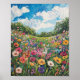 Esta pintura vibrante retrata um campo de flores silvestres sob um céu azul brilhante. Apresentando margaridas, papoilas e outros florins em tons de laranja, rosa, vermelho, azul e branco, o trabalho de arte capta uma cena exuberante e viva. O céu limpo com nuvens brancas lisas adiciona profundidade, enquanto o estilo impressionista com pinceladas ousadas e cores vívidas evoca um dia alegre e ensolarado. Perfeito para iluminar qualquer quarto com um toque da natureza.