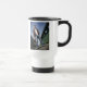 Caneca de viagem que caracteriza "a tempo" o logotipo e uma foto de Ryan que estão em uma ponte