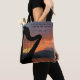 Tote Bag com o pôr do sol sobre o mar de Bering e a silhueta de uma harpa com as palavras de Lao Tzu, Música da alma, podem ser ouvidas pelo Universo.