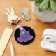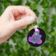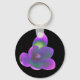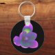 Este maravilhoso chaveiro floral apresenta uma foto de uma flor de croco que foi alterada digitalmente acrescentando um filtro para criar tons de rosa, verde, azul e roxo. A flor está sobre fundo preto.