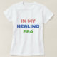 Uma camisa vibrante com a frase "Na minha era da cura" em um espectro de letras coloridas, expressando uma jornada em direção ao crescimento pessoal e ao bem-estar.