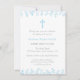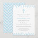 Um convite moderno e na moda de Natal ou Batismo em azul pastel. Design tem a cruz sagrada no centro e folhas decorativas para a fronteira. Na página inversa há um padrão de ziguezague branco e azul pastel. Personalize facilmente com detalhes do evento para batismo do bebê.