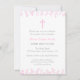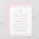 Um convite moderno e na moda de Natal ou Batismo em rosa pastel. Design tem a cruz sagrada no centro e folhas decorativas para a fronteira. Na página inversa há um padrão de ziguezague branco e cor-de-rosa pastel. Personalize facilmente com detalhes de eventos para batismo de menina.